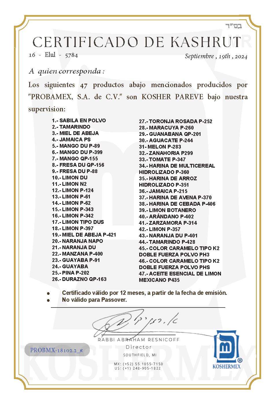 Reconoce que el Sistema de Gestión de Inocuidad Alimentaria de Probamex cumple con los más altos estándares internacionales (ISO 22000:2018, ISO/TS 22002-1:2009 y requisitos adicionales de FSSC 22000). Este certificado avala la producción de color caramelo, azúcar de caña líquida, mezclas de polvos y líquidos, así como productos deshidratados como miel de abeja, garantizando procesos seguros y de calidad en la industria alimentaria.